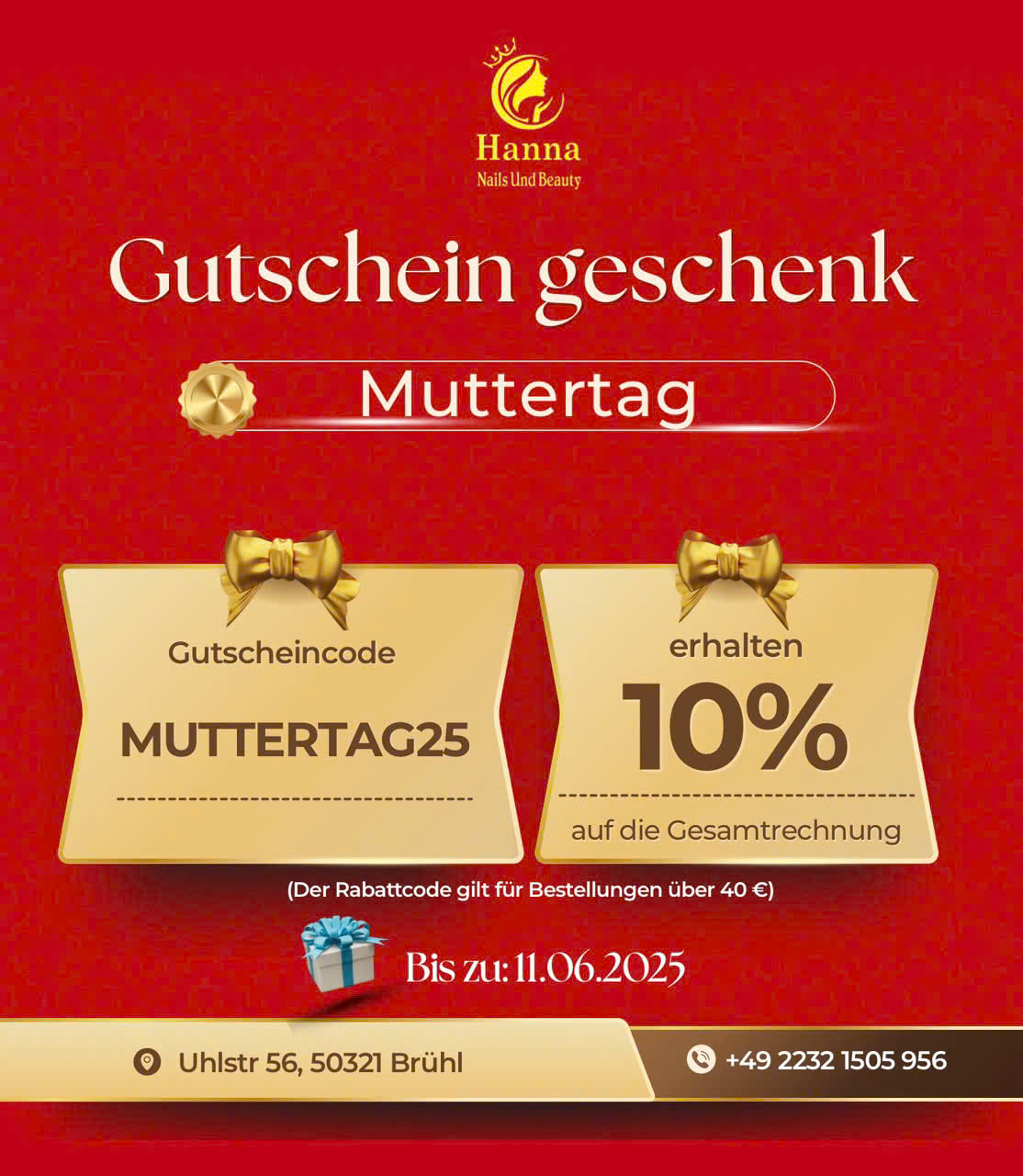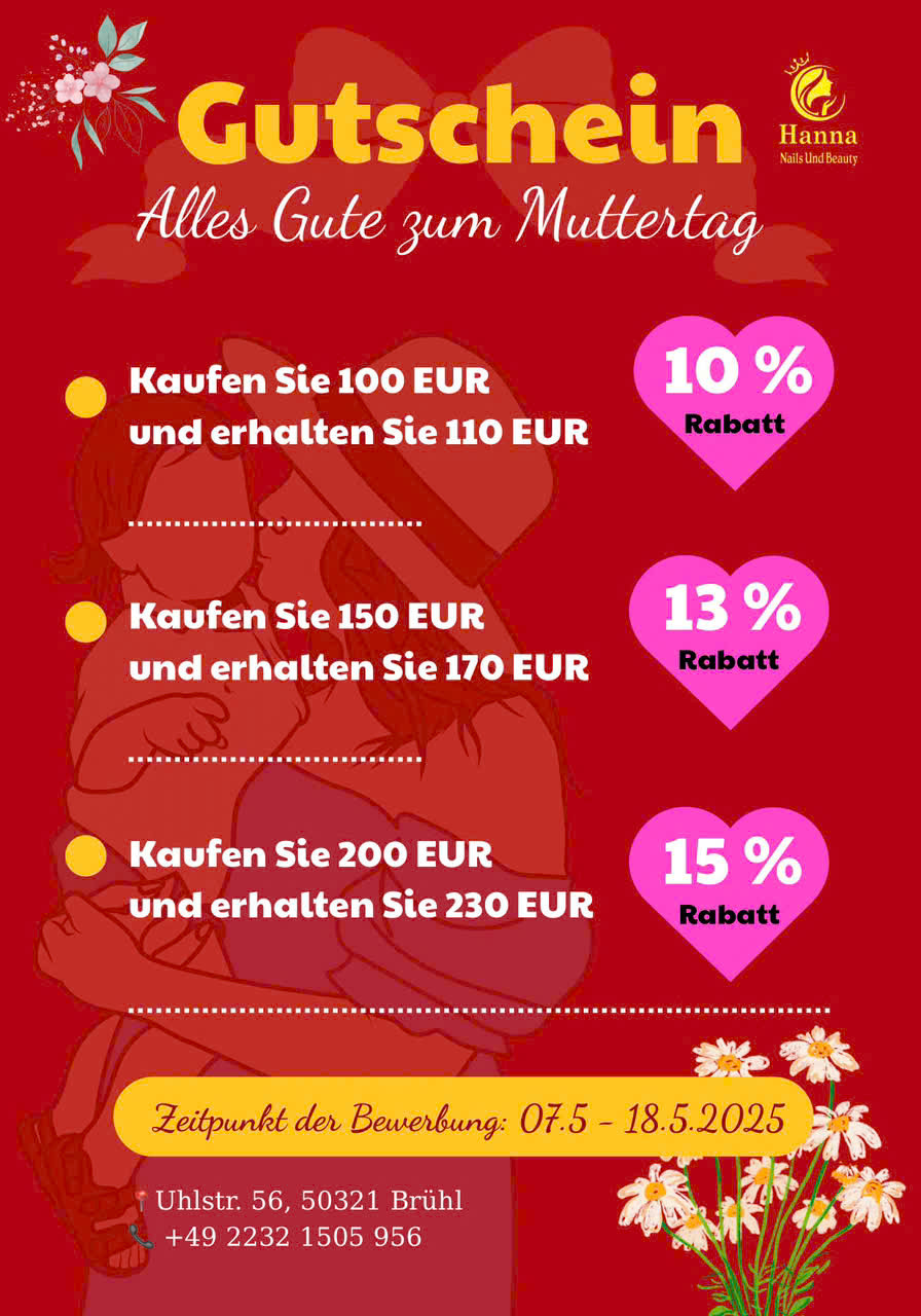 Anlässlich des Muttertags möchte HannaNails Ihnen ein Gratitude-Gutschein programm zusenden – ein sowohl zartes als auch praktisches Geschenk, mit dem Sie der wichtigsten Frau in Ihrem Leben Ihre Liebe ausdrücken können.