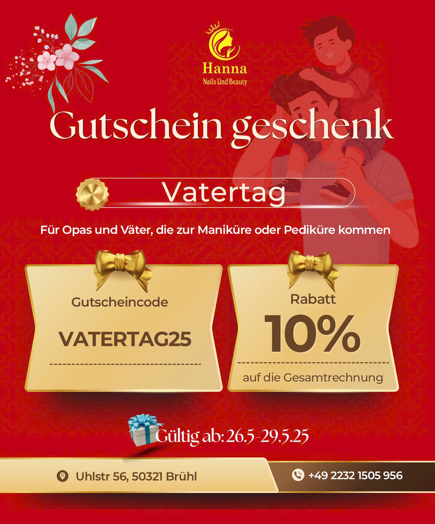 Vom 26. bis 29. Mai erhalten liebe Ehemänner, Väter und Großväter 10% Rabatt, wenn sie für eine Maniküre oder Pediküre zu Hannanails kommen!